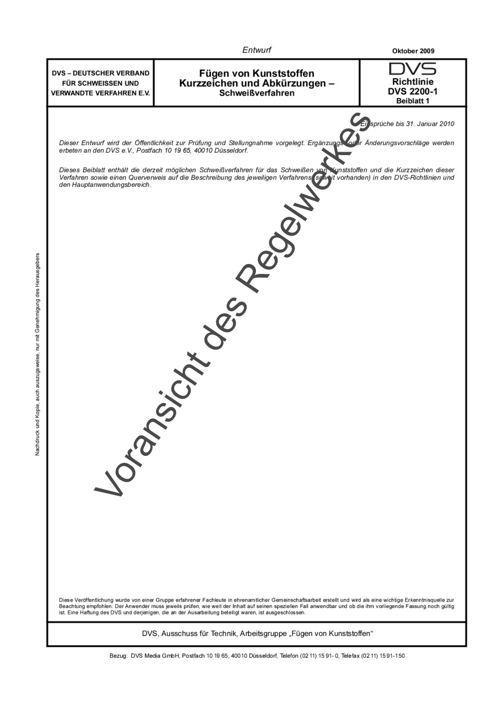 Dieses Beiblatt enthält die derzeit möglichen Schweißverfahren für das Schweißen von Kunststoffen und die Kurzzeichen dieser Verfahren sowie einen Querverweis auf die Beschreibung des jeweiligen Verfahrens (soweit vorhanden) in den DVS-Richtlinien und den Hauptanwendungsbereich.