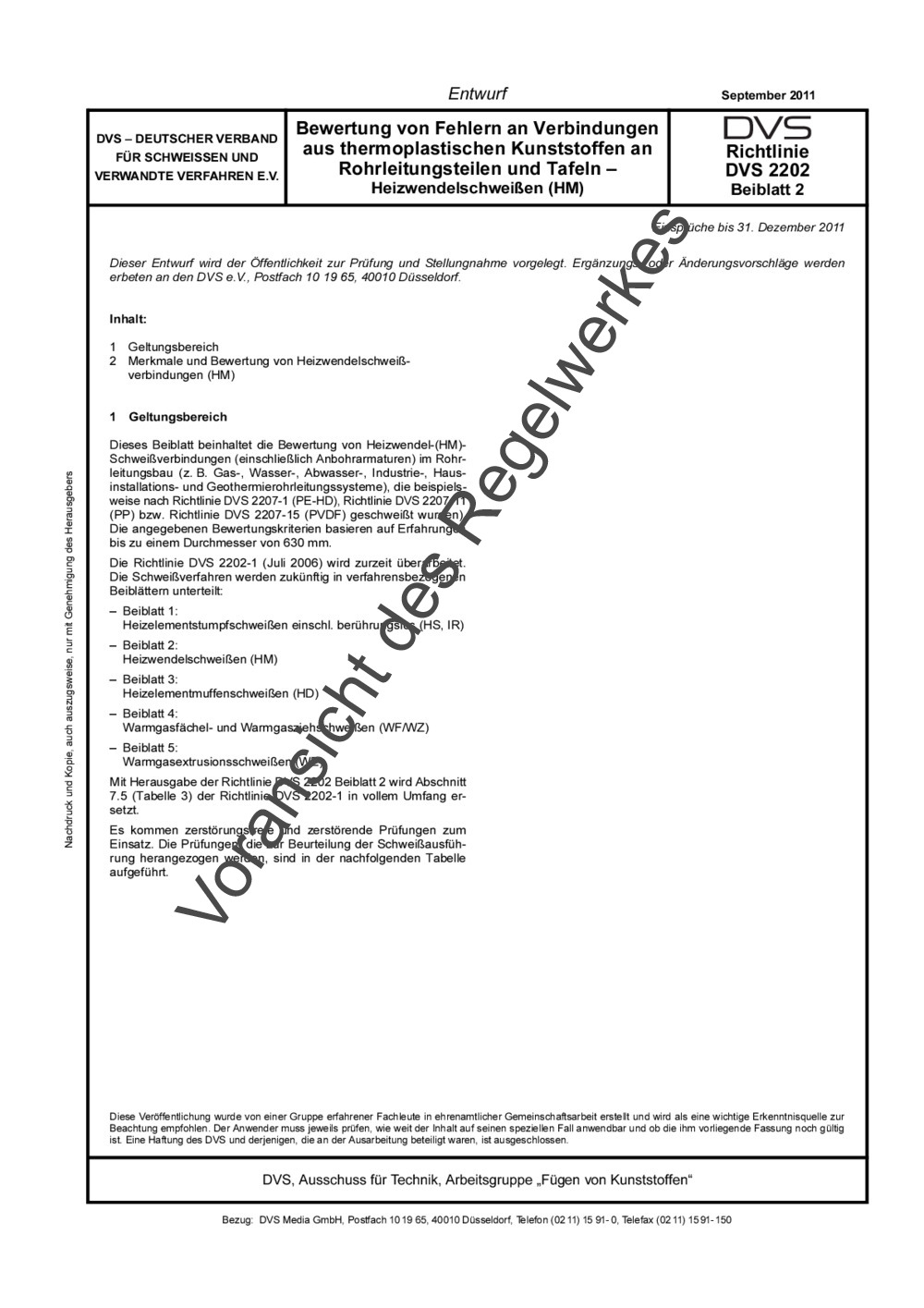 Dieses Beiblatt beinhaltet die Bewertung von Heizwendel-(HM)-Schweißverbindungen (einschließlich Anbohrarmaturen) im Rohrleitungsbau (z. B. Gas-, Wasser-, Abwasser-, Industrie-, Hausinstallations- und Geothermierohrleitungssysteme), die beispielsweise nach Richtlinie DVS 2207-1 (PE-HD), Richtlinie DVS 2207-11(PP) bzw. Richtlinie DVS 2207-15 (PVDF) geschweißt wurden). Die angegebenen Bewertungskriterien basieren auf Erfahrungen bis zu einem Durchmesser von 630 mm.