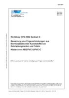 Dieses Beiblatt beinhaltet die Bewertung von Klebverbindungen im Rohrleitungsbau (z. B. Gas-, Wasser-, Abwasser-, Industrie und Haus-installationsysteme), die z. B. nach Richtlinie DVS 2204-3 (ABS), -4 (PVC-U) bzw. -5 (PVC-C) geklebt wurden. Die angegebenen Bewertungskriterien basieren auf Erfahrungen mit geklebten Rohrleitungen bis zum Durchmesser 315 mm. Es kommen zerstörungsfreie und zerstörende Prüfungen zum Einsatz.