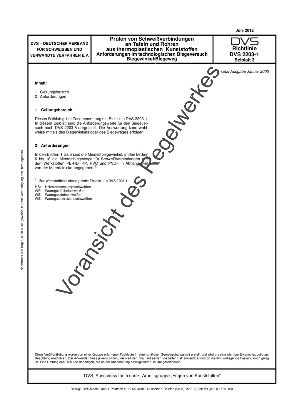 Dieses Beiblatt gilt in Zusammenhang mit Richtlinie DVS 2203-1. In diesem Beiblatt sind die Anforderungswerte für den Biegeversuch nach DVS 2203-5 dargestellt. Die Auswertung kann wahlweise mittels des Biegewinkels oder des Biegeweges erfolgen.