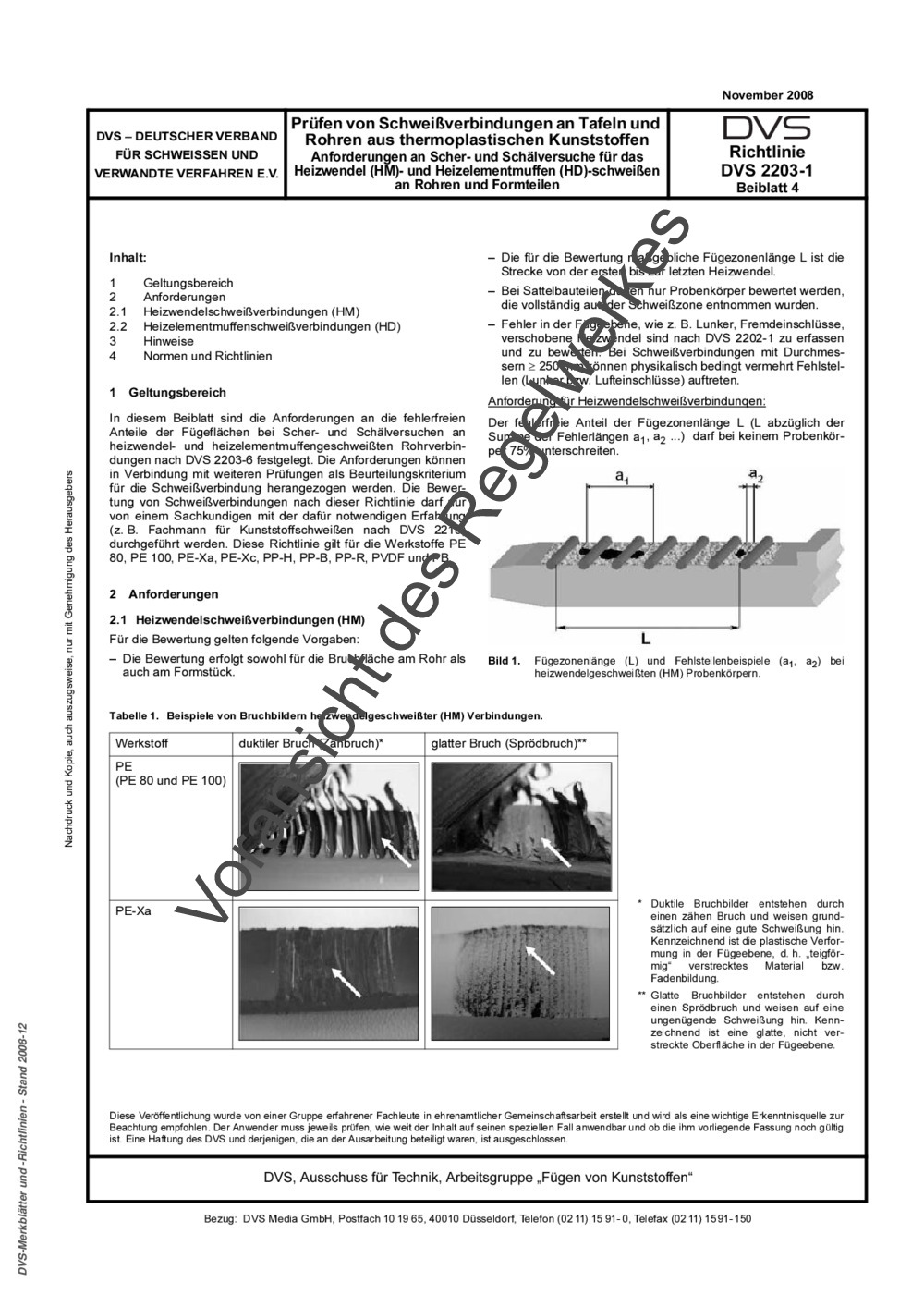 In diesem Beiblatt sind die Anforderungen an die fehlerfreien Anteile der Fügeflächen bei Scher- und Schälversuchen an heizwendel- und heizelementmuffengeschweißten Rohrverbindungen nach DVS 2203-6 festgelegt. Die Anforderungen können in Verbindung mit weiteren Prüfungen als Beurteilungskriterium für die Schweißverbindung herangezogen werden. Die Bewertung von Schweißverbindungen nach dieser Richtlinie darf nur von einem Sachkundigen mit der dafür notwendigen Erfahrung (z. B. Fachmann für Kunststoffschweißen nach DVS 2213) durchgeführt werden. Diese Richtlinie gilt für d ie Werkstoffe PE 80, PE 100, PE-Xa, PE-Xc, PP-H, PP-B, PP-R, PVDF und PB.