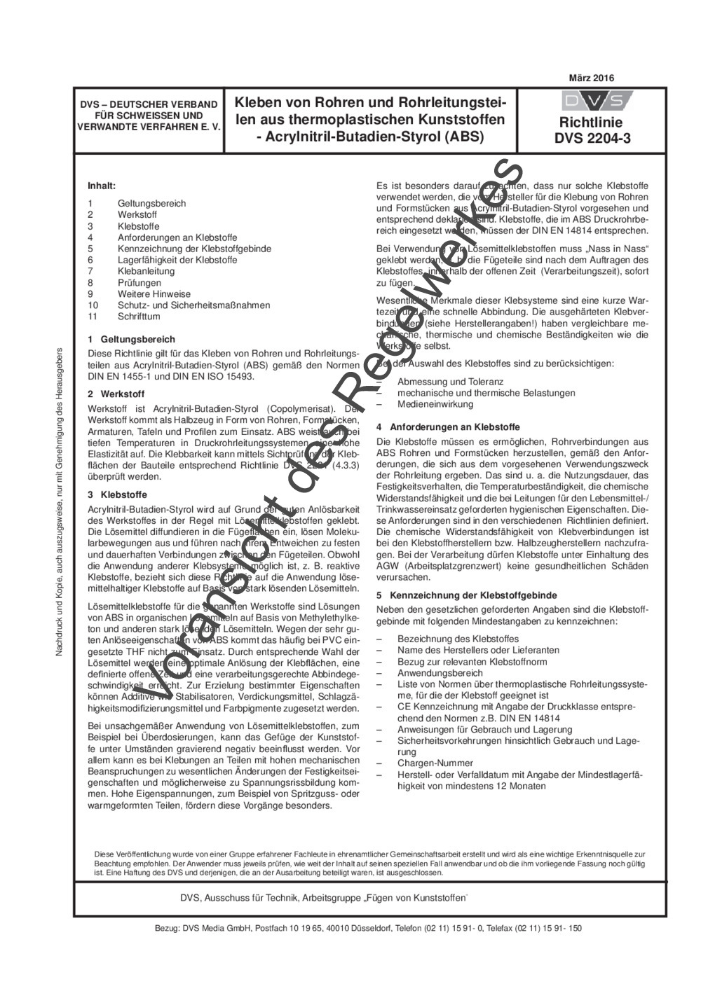 Diese Richtlinie gilt für das Kleben von Rohren und Rohrleitungsteilen aus Acrylnitril-Butadien-Styrol (ABS) gemäß den Normen DIN EN 1455-1 "Kunststoff-Rohrleitungssysteme zum Ableiten von Abwasser (niedriger und hoher Temperatur) innerhalb der Gebäudestruktur- Acrylnitril-Butadien-Styrol (ABS)" und DIN EN ISO 15493 "Kunststoff-Rohrleitungssysteme für industrielle Anwendungen - Acrylnitril-Butadien-Styrol (ABS), weichmacherfreies Polyvinylchlorid (PVC-U) und chloriertes Polyvinylchlorid (PVC-C) - Anforderungen an Rohrleitungsteile und das Rohrleitungssystem". Werkstoff ist Acrylnitril-Butadien-Styrol (Copolymerisat). Der Werkstoff kommt als Halbzeug in Form von Rohren, Formstücken, Armaturen, Tafeln und Profilen zum Einsatz. Acrylnitril-Butadien-Styrol wird auf Grund der guten Anlösbarkeit des Werkstoffes in der Regel mit Lösemittelklebstoffen geklebt. Die Lösemittel diffundieren in die Fügeflächen ein, lösen Molekularbewegungen aus und führen nach ihrem Entweichen zu festen und dauerhaften Verbindungen zwischen den Fügeteilen. Obwohl die Anwendung anderer Klebsysteme möglich ist, z. B. reaktive Klebstoffe, bezieht sich diese Richtlinie auf die Anwendung lösemittelhaltiger Klebstoffe auf Basis von stark lösenden Lösemitteln.