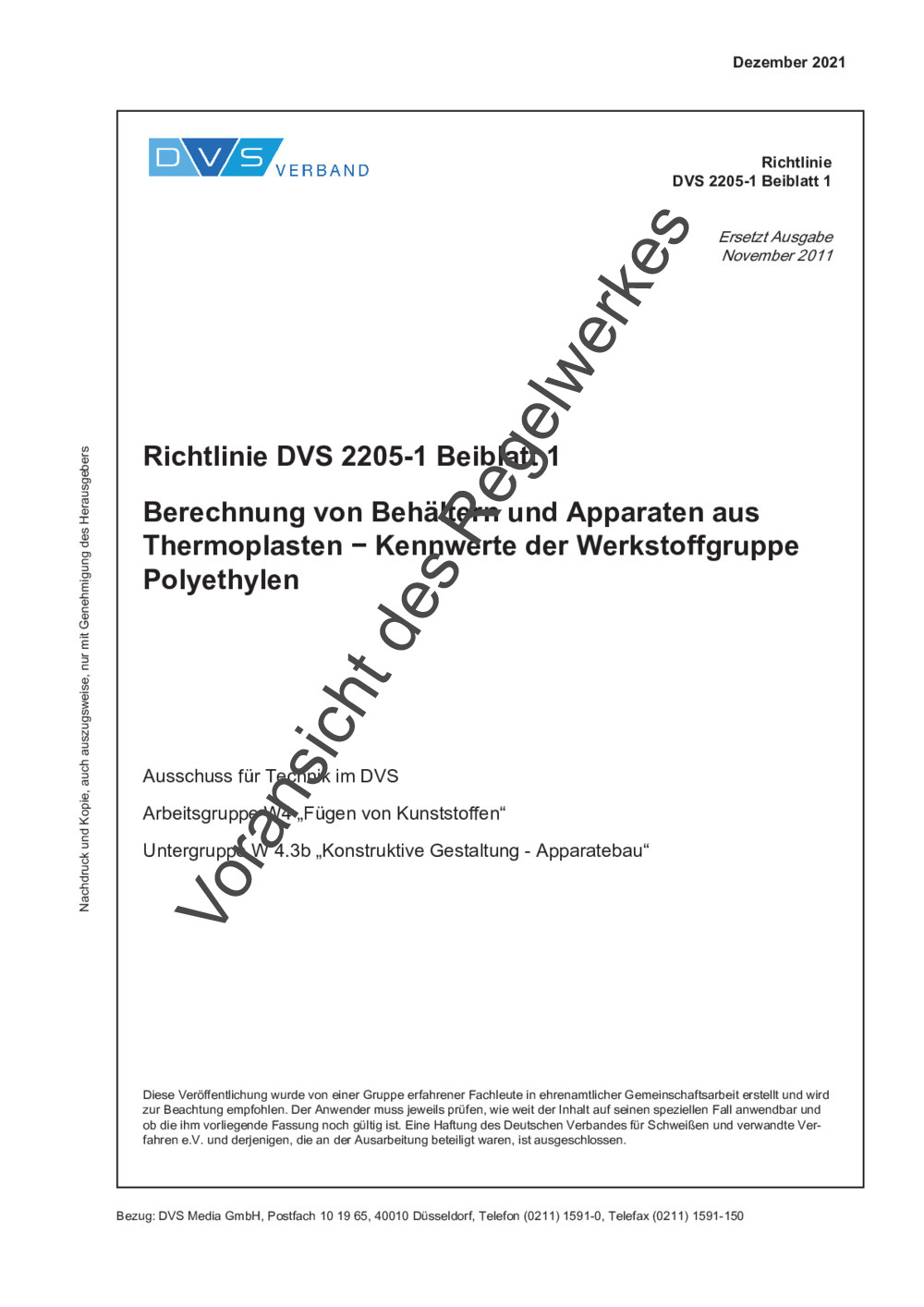 Die Richtlinie DVS 2205-1 gibt dem Verarbeiter von Halbfabrikaten aus thermoplastischen Kunststoffen Hinweise zur Ermittlung von Kennwerten als Berechnungsgrundlage für den Behälter-, Apparate-und Lüftungsbau sowie für Industrierohrleitungen. Dieses Beiblatt 1 der Richtlinie 2205-1 enthält Kennwerte für die Werkstoffe PE 6 3, PE 8 0, PE 1 00, PE 100-RC und PE-el.
