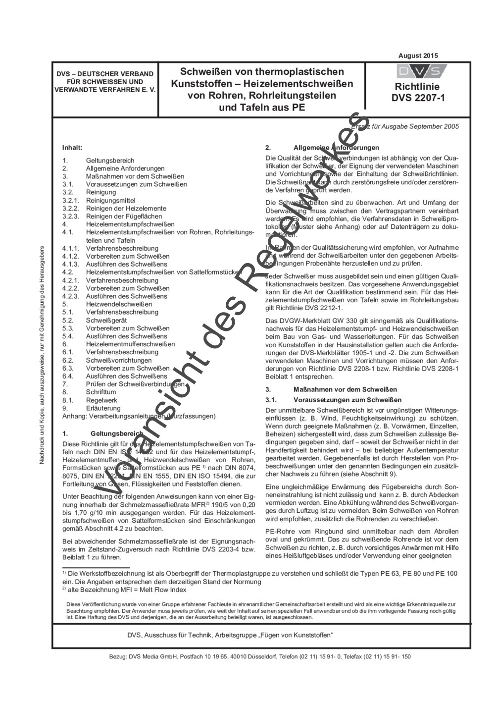 Diese Richtlinie gilt für das Heizelementstumpfschweißen von Tafeln nach DIN EN ISO 14632 und für das Heizelementstumpf-, Heizelementmuffen- und Heizwendelschweißen von Rohren, Formstücken sowie Sattelformstücken aus PE (Die Werkstoffbezeichnung PE ist als Oberbegriff der Thermoplastgruppe zu verstehen und schließt die Typen PE 63, PE 80 und PE 100 ein) nach DIN 8074, 8075, DIN EN 12201, DIN EN 1555, DIN EN ISO 15494, die zur Fortleitung von Gasen, Flüssigkeiten und Feststoffen dienen.