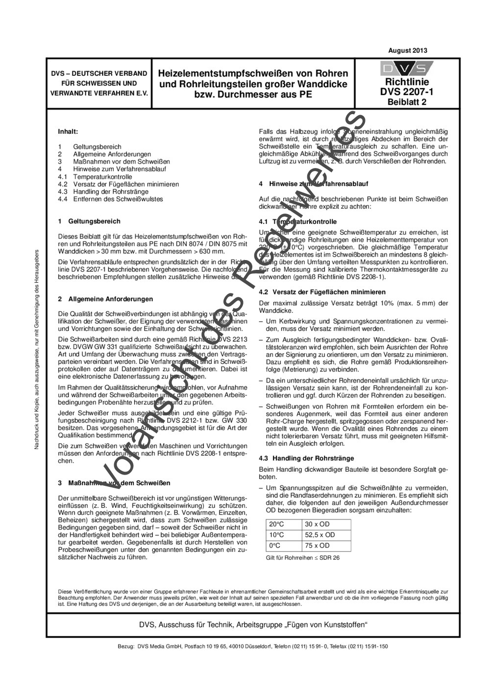 Dieses Beiblatt gilt für das Heizelementstumpfschweißen von Rohren- und Rohrleitungsteilen aus PE nach DIN 8074 / DIN 8075 mit Wanddicken > 30 mm bzw. mit Durchmessern > 630 mm. Die Verfahrensabläufe entsprechen grundsätzlich der in der Richtlinie DVS 2207-1 beschriebenen Vorgehensweise. Die nachfolgendbeschriebenen Empfehlungen stellen zusätzliche Hinweise dar.