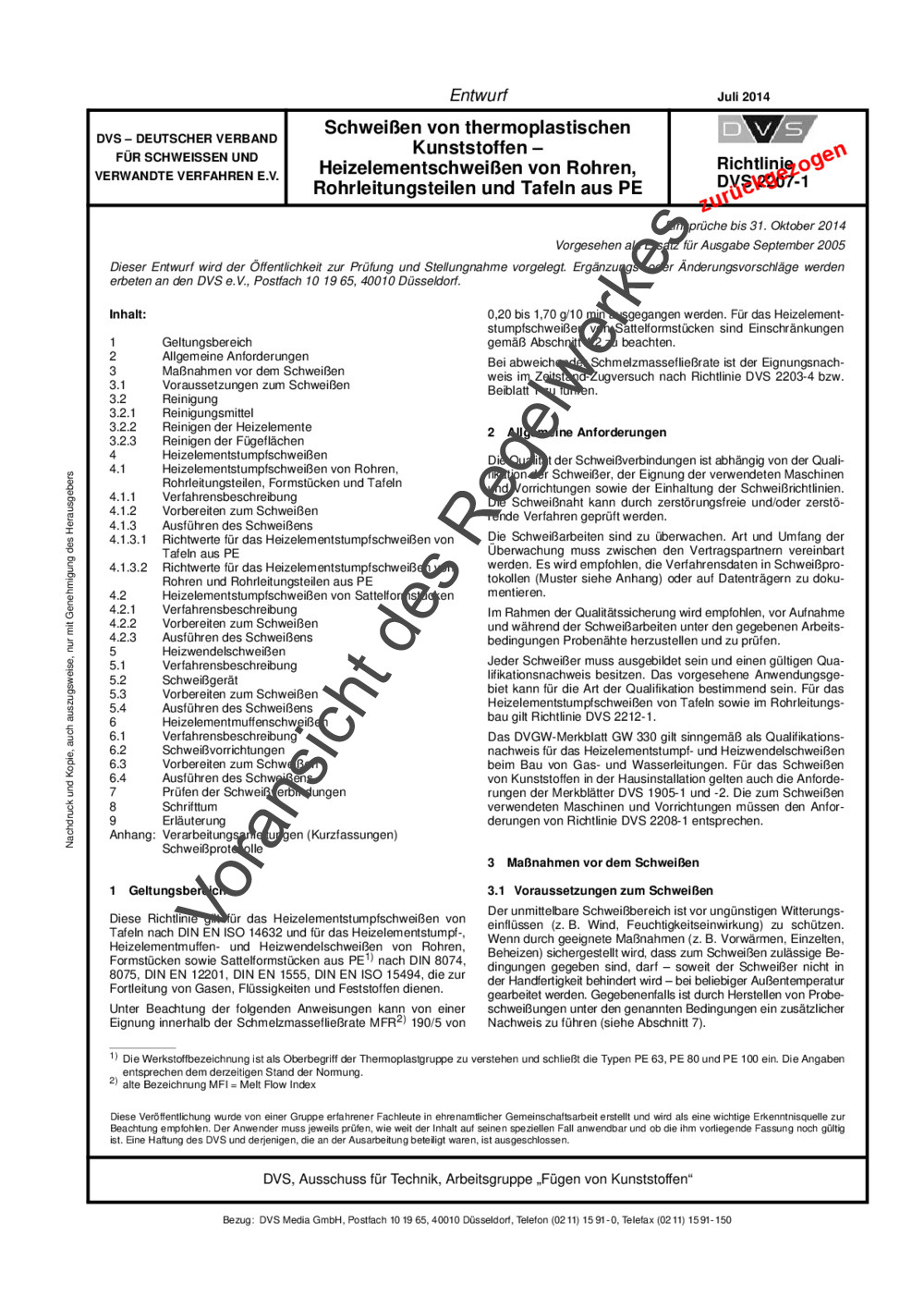 ENTWURF - Schweißen von thermoplastischen Kunststoffen – Heizelementschweißen von Rohren, Rohrleitungsteilen und Tafeln aus PVC-C