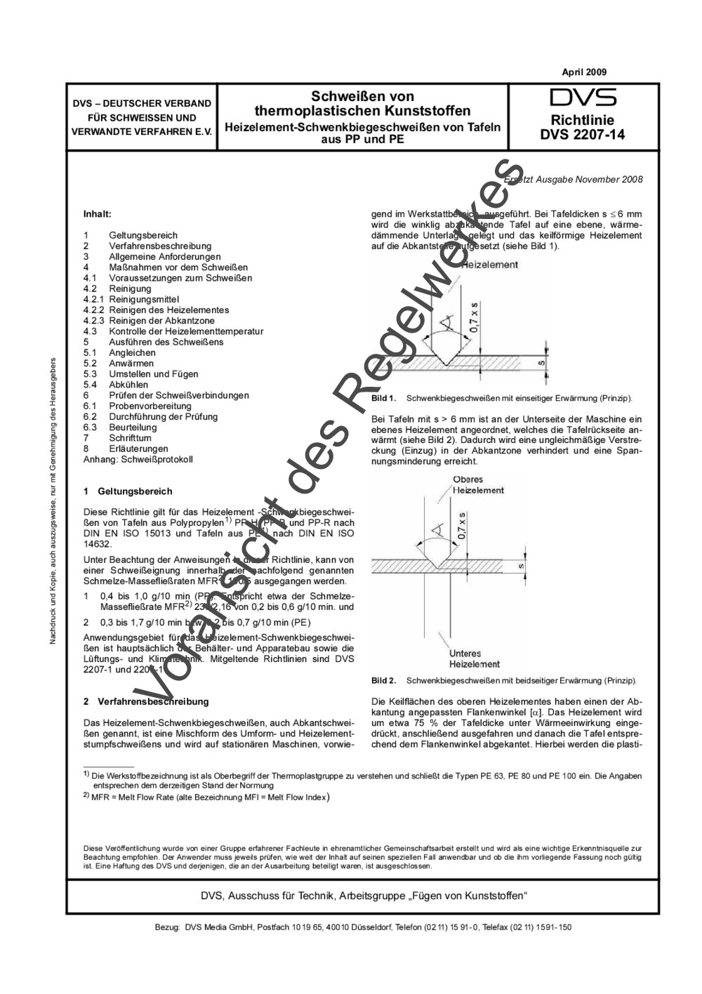 Diese Richtlinie gilt für das Heizelement -Schwenkbiegeschweißen von Tafeln aus Polypropylen1) PP-H, PP-B und PP-R nach DIN EN ISO 15013 und Tafeln aus PE1) nach DIN EN ISO 14632. Unter Beachtung der Anweisungen in dieser Richtlinie, kann von einer Schweißeignung innerhalb der nachfolgend genannten Schmelze-Massefließraten MFR2) 190/5 ausgegangen werden. 1 0,4 bis 1,0 g/10 min (PP). Entspricht etwa der Schmelze-Massefließrate MFR2) 230/2,16 von 0,2 bis 0,6 g/10 min. und 2 0,3 bis 1,7 g/10 min bzw. 0,2 bis 0,7 g/10 min (PE) Anwendungsgebiet für das Heizelement-Schwenkbiegeschweißen ist hauptsächlich der Behälter- und Apparatebau sowie die Lüftungs- und Klimatechnik. Mitgeltende Richtlinien sind DVS 2207-1 und 2207-11.