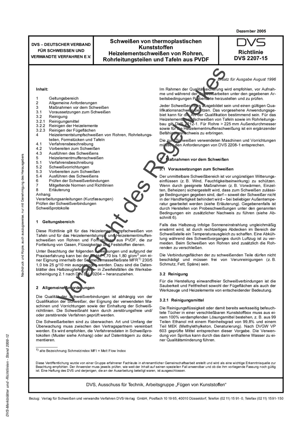 Diese Richtlinie gilt für das Heizelementstumpfschweißen von Tafeln und für das Heizelementstumpf- und Heizelementmuffenschweißen von Rohren und Formstücken aus PVDF, die zur Fortleitung von Gasen, Flüssigkeiten und Feststoffen dienen. Unter Beachtung der folgenden Anweisungen und aufgrund der Praxiserfahrung kann bei der Dichte 1,70 bis 1,80 g/cm3 von einer Eignung innerhalb der Schmelzemassefließrate MFR1) 230/5 1,0 bis 25 g/10 min ausgegangen werden. Dazu sind die Datenblätter des Halbzeuglieferanten – in Zweifelsfällen die Werksbescheinigung 2.1 nach DIN EN 10204 – heranzuziehen.