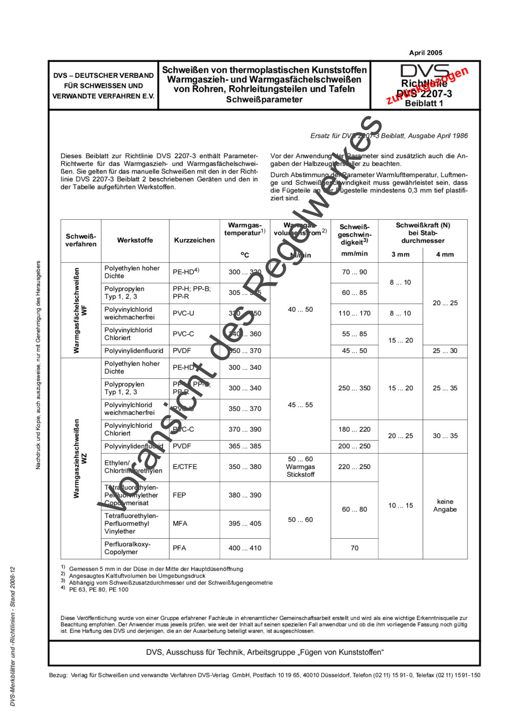 Dieses Beiblatt zur Richtlinie DVS 2207-3 enthält Parameter- Richtwerte für das Warmgaszieh- und Warmgasfächelschweißen. Sie gelten für das manuelle Schweißen mit den in der Richtlinie DVS 2207-3 Beiblatt 2 beschriebenen Geräten und den in der Tabelle aufgeführten Werkstoffen. Vor der Anwendung der Parameter sind zusätzlich auch die Angaben der Halbzeughersteller zu beachten. Durch Abstimmung der Parameter Warmlufttemperatur, Luftmenge und Schweißgeschwindigkeit muss gewährleistet sein, dass die Fügeteile an der Fügestelle mindestens 0,3 mm tief plastifiziert sind.