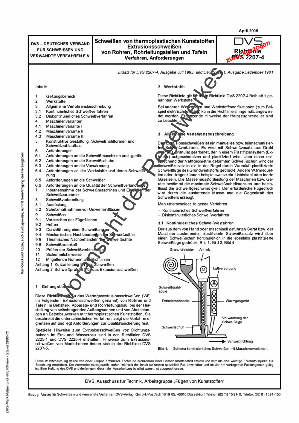 Diese Richtlinie gilt für das Warmgasextrusionsschweißen (WE, im Folgenden Extrusionsschweißen genannt) von Rohren und Tafeln im Behälter-, Apparate- und Rohrleitungsbau, bei der Herstellung von selbsttragenden Auffangwannen und von Abdichtungen an Betonbauwerken mit thermoplastischen Kunststoffen. Sie beschreibt die unterschiedlichen Verfahren, zeigt die Verfahrensgrenzen auf und legt Anforderungen zur Qualitätssicherung fest. Spezielle Hinweise zum Extrusionsschweißen von Dichtungsbahnen im Erd- und Wasserbau sind in den Richtlinien DVS 2225-1 und DVS 2225-4 enthalten. Hinweise zum Extrusionsschweißen von Mantelrohren finden sich in der Richtlinie DVS 2207-5.