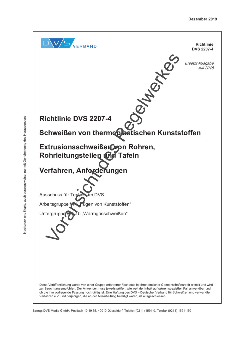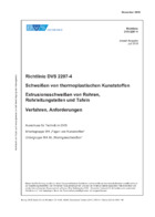 Diese Richtlinie gilt für das Warmgasextrusionsschweißen (WE) (im Folgenden Extrusionsschweißen) von Rohren und Tafeln im Behälter-, Apparate- und Rohrleitungsbau, bei der Herstellung von selbsttragenden Auff angwannen und von Abdichtungen an Betonbauwerken mit thermoplastischen Kunststoffen. Sie beschreibt die unterschiedlichen Verfahren, zeigt die Verfahrensgrenzen auf und legtAnforderungen zur Qualitätssicherung fest.