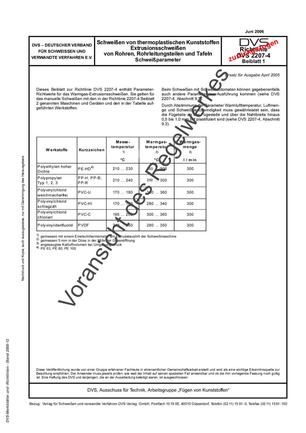 Dieses Beiblatt zur Richtlinie DVS 2207-4 enthält Parameter- Richtwerte für das Warmgas-Extrusionsschweißen. Sie gelten für das manuelle Schweißen mit den in der Richtlinie 2207-4 Beiblatt 2 genannten Maschinen und Geräten und den in der Tabelle aufgeführten Werkstoffen. Beim Schweißen mit Schweißautomaten können gegebenenfalls auch andere Parameter zur Ausführung kommen (siehe DVS 2207-4, Abschnitt 9.3). Durch Abstimmung der Parameter Warmlufttemperatur, Luftmenge und Schweißgeschwindigkeit muss gewährleistet sein, dass die Fügeteile an der Fügestelle und über die Nahtbreite hinaus 0,5 bis 1,0 mm tief plastifiziert sind (siehe DVS 2207-4, Abschnitt 9.3).