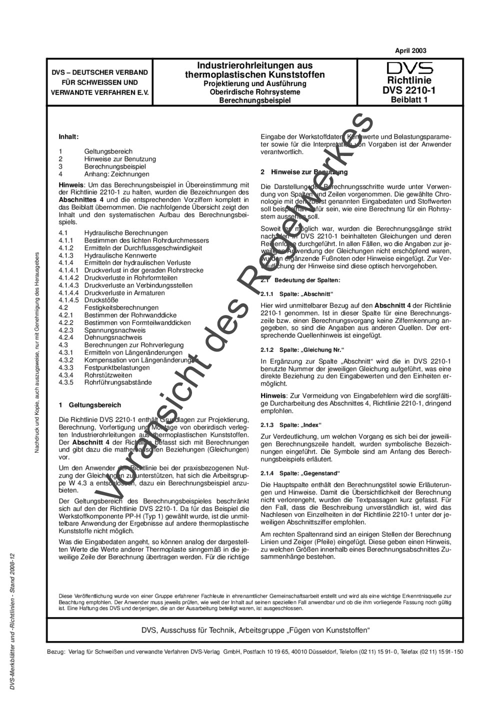 Die Richtlinie DVS 2210-1 enthält Grundlagen zur Projektierung, Berechnung, Vorfertigung und Montage von oberirdisch verlegten Industrierohrleitungen aus thermoplastischen Kunststoffen. Der Abschnitt 4 der Richtlinie befasst sich mit Berechnungen und gibt dazu die mathematischen Beziehungen (Gleichungen) vor. Um den Anwender der Richtlinie bei der praxisbezogenen Nutzung der Gleichungen zu unterstützen, hat sich die Arbeitsgruppe W 4.3 a entschlossen, dazu ein Berechnungsbeispiel anzubieten. Der Geltungsbereich des Berechnungsbeispieles beschränkt sich auf den der Richtlinie DVS 2210-1. Da für das Beispiel die Werkstoffkomponente PP-H (Typ 1) gewählt wurde, ist die unmittelbare Anwendung der Ergebnisse auf andere thermoplastische Kunststoffe nicht möglich. Was die Eingabedaten angeht, so können analog der dargestellten Werte die Werte anderer Thermoplaste sinngemäß in die jeweilige Zeile der Berechnung übertragen werden. Für die richtige Eingabe der Werkstoffdaten, Kennwerte und Belastungsparameter sowie für die Interpretation von Vorgaben ist der Anwender verantwortlich.