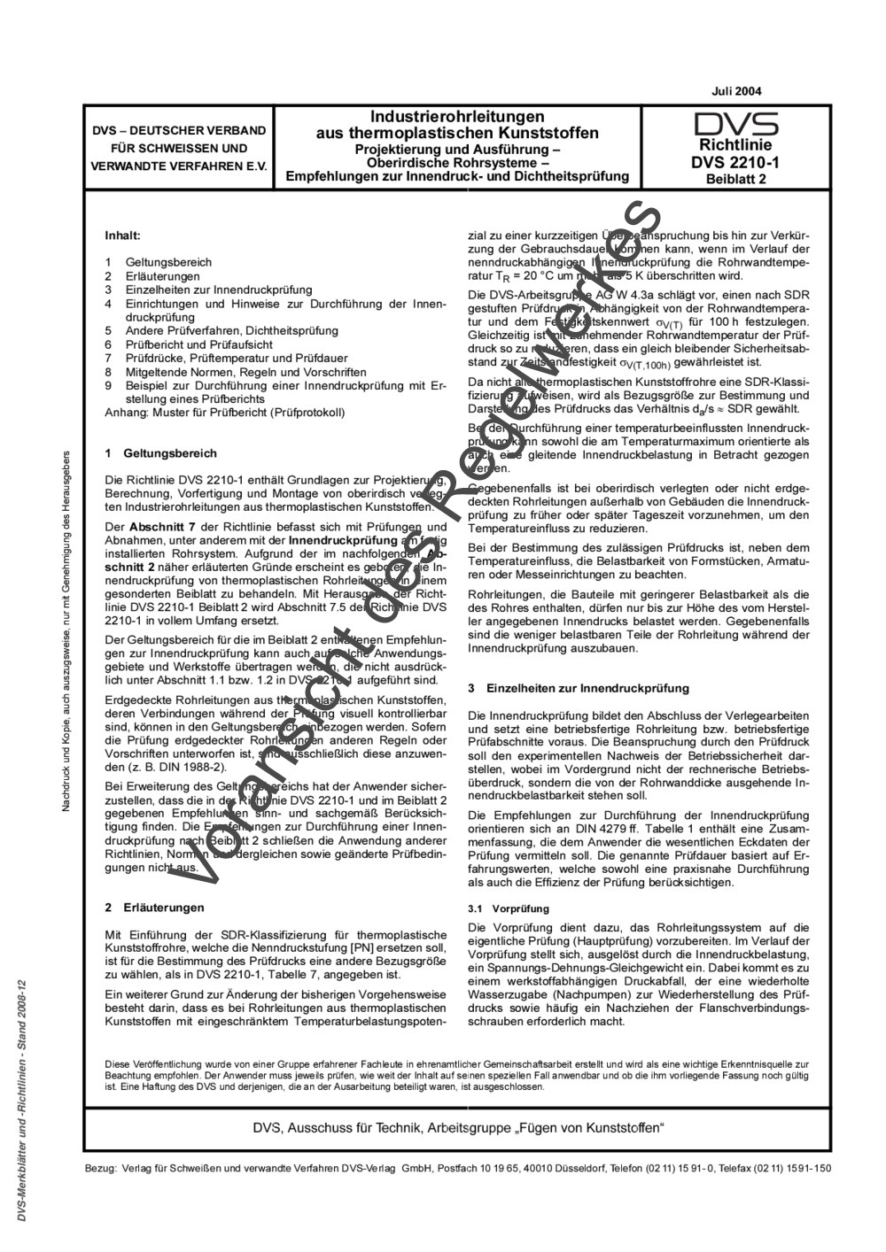 Die Richtlinie DVS 2210-1 enthält Grundlagen zur Projektierung, Berechnung, Vorfertigung und Montage von oberirdisch verlegten Industrierohrleitungen aus thermoplastischen Kunststoffen. Der Abschnitt 7 der Richtlinie befasst sich mit Prüfungen und Abnahmen, unter anderem mit der Innendruckprüfung am fertig installierten Rohrsystem. Aufgrund der im nachfolgenden Abschnitt 2 näher erläuterten Gründe erscheint es geboten, die Innendruckprüfung von thermoplastischen Rohrleitungen in einem gesonderten Beiblatt zu behandeln. Mit Herausgabe der Richtlinie DVS 2210-1 Beiblatt 2 wird Abschnitt 7.5 der Richtlinie DVS 2210-1 in vollem Umfang ersetzt. Der Geltungsbereich für die im Beiblatt 2 enthaltenen Empfehlungen zur Innendruckprüfung kann auch auf solche Anwendungsgebiete und Werkstoffe übertragen werden, die nicht ausdrücklich unter Abschnitt 1.1 bzw. 1.2 in DVS 2210-1 aufgeführt sind. Erdgedeckte Rohrleitungen aus thermoplastischen Kunststoffen, deren Verbindungen während der Prüfung visuell kontrollierbar sind, können in den Geltungsbereich einbezogen werden. Sofern die Prüfung erdgedeckter Rohrleitungen anderen Regeln oder Vorschriften unterworfen ist, sind ausschließlich diese anzuwenden (z. B. DIN 1988-2). Bei Erweiterung des Geltungsbereichs hat der Anwender sicherzustellen, dass die in der Richtlinie DVS 2210-1 und im Beiblatt 2 gegebenen Empfehlungen sinn- und sachgemäß Berücksichtigung finden. Die Empfehlungen zur Durchführung einer Innendruckprüfung nach Beiblatt 2 schließen die Anwendung anderer Richtlinien, Normen und dergleichen sowie geänderte Prüfbedingungen nicht aus.