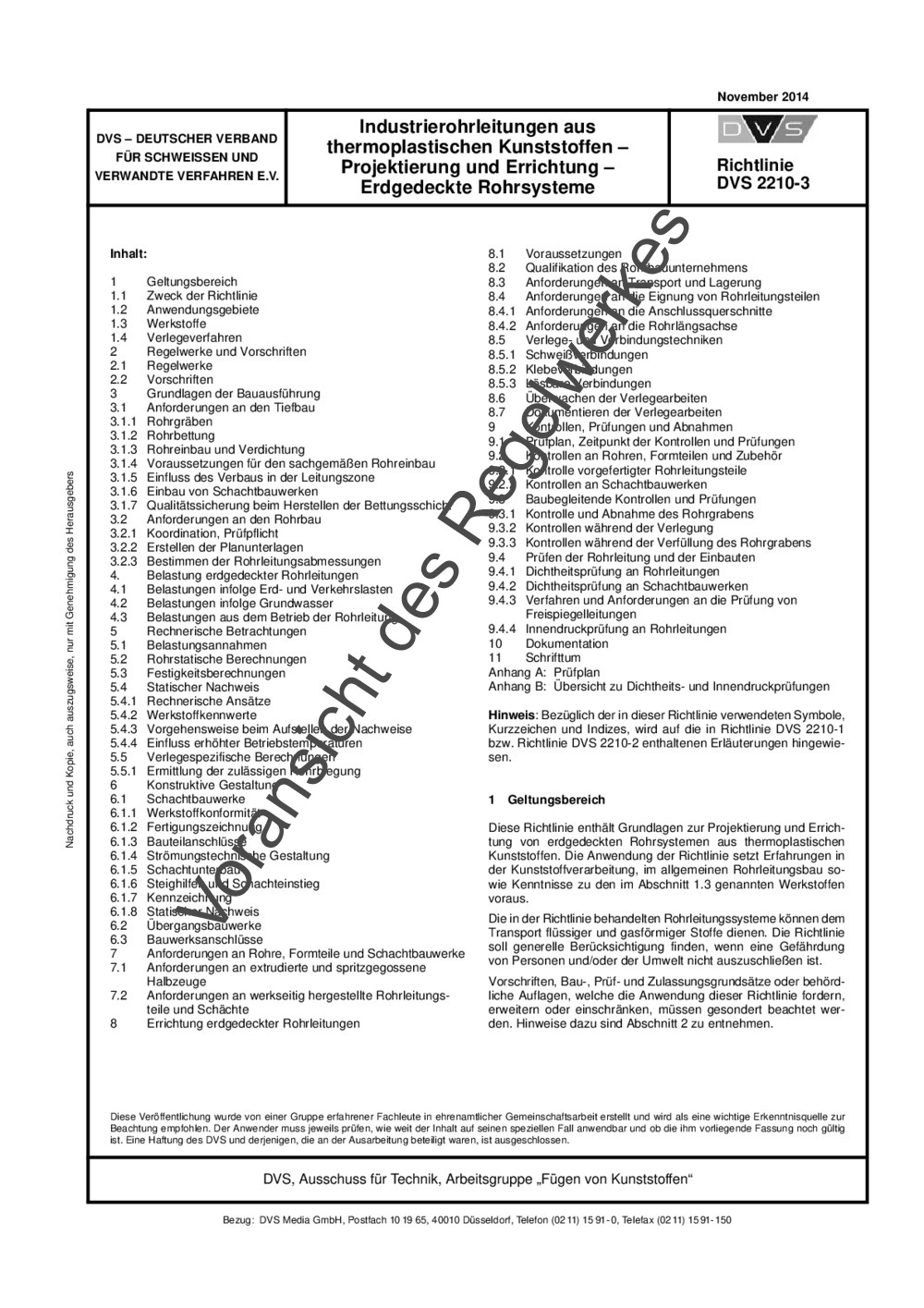 Diese Richtlinie enthält Grundlagen zur Projektierung und Errichtung von erdgedeckten Rohrsystemen aus thermoplastischen Kunststoffen. Die Anwendung der Richtlinie setzt Erfahrungen in der Kunststoffverarbeitung, im allgemeinen Rohrleitungsbau sowie Kenntnisse zu den im Abschnitt 1.3 genannten Werkstoffen voraus. Die in der Richtlinie behandelten Rohrleitungssysteme können dem Transport flüssiger und gasförmiger Stoffe dienen. Die Richtlinie soll generelle Berücksichtigung finden, wenn eine Gefährdung von Personen und/oder der Umwelt nicht auszuschließen ist.