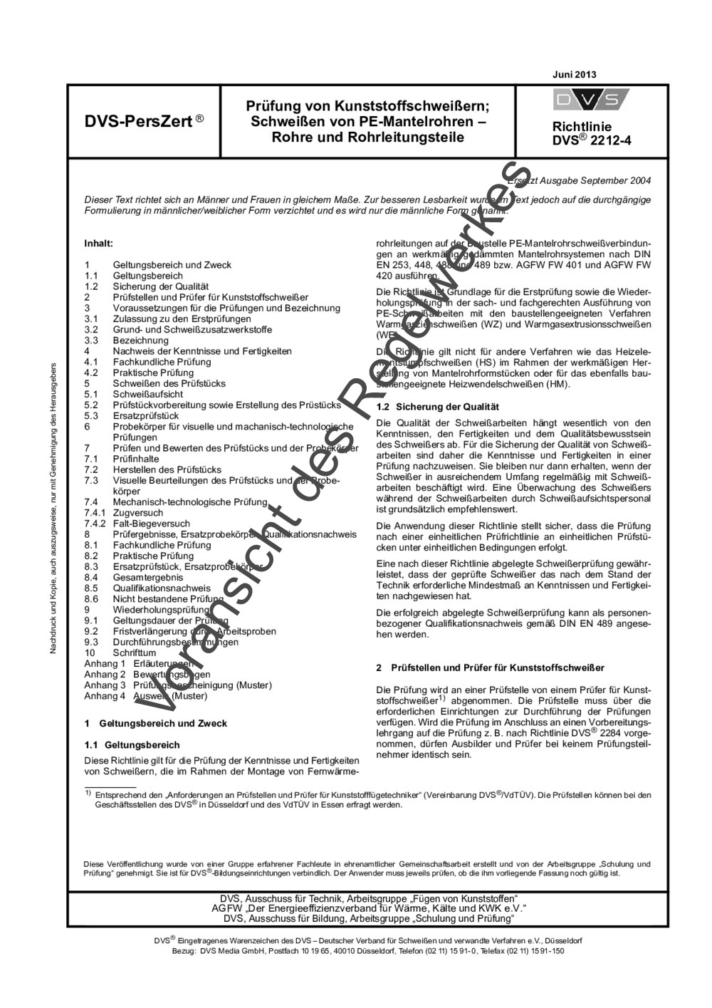 Diese Richtlinie gilt für die Prüfung der Kenntnisse und Fertigkeitenvon Schweißern, die im Rahmen der Montage von Fernwärmerohrleitungen auf der Baustelle PE-Mantelrohrschweißverbindungen an werkmäßig gedämmten Mantelrohrsystemen nach DIN EN 253, 448, 488 und 489 bzw. AGFW FW 401 und AGFW FW 420 ausführen. Die Richtlinie ist Grundlage für die Erstprüfung sowie die Wiederholungsprüfung in der sach- und fachgerechten Ausführung von PE-Schweißarbeiten mit den baustellengeeigneten Verfahren Warmgasziehschweißen (WZ) und Warmgasextrusionsschweißen(WE). Die Richtlinie gilt nicht für andere Verfahren wie das Heizelementstumpfschweißen (HS) im Rahmen der werkmäßigen Herstellung von Mantelrohrformstücken oder für das ebenfalls baustellengeeignete Heizwendelschweißen (HM).