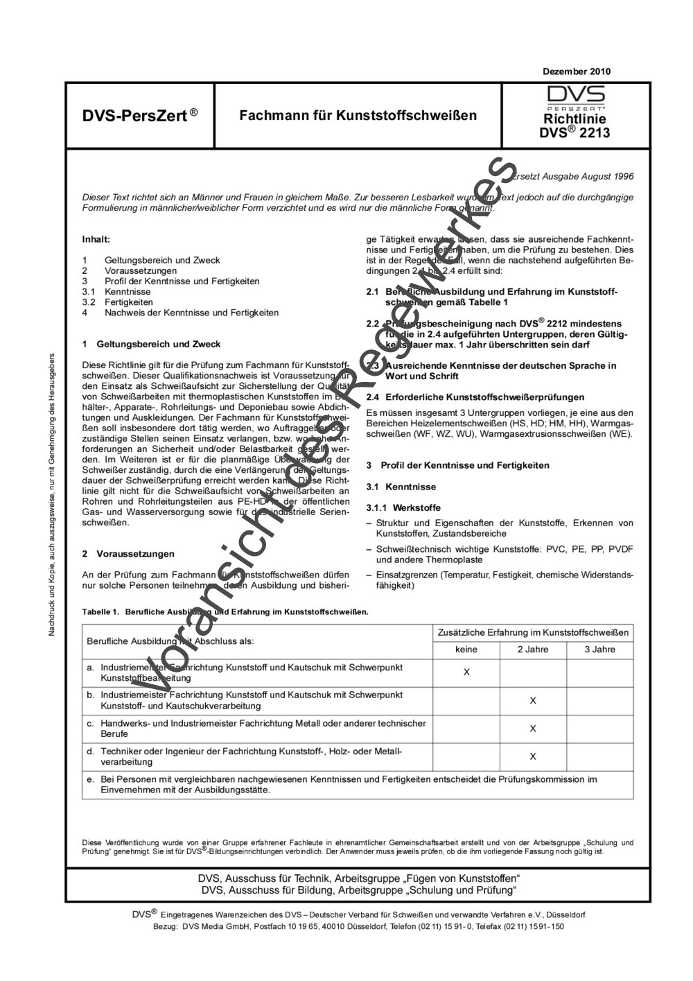 Diese Richtlinie gilt für die Prüfung zum Fachmann für Kunststoffschweißen. Dieser Qualifikationsnachweis ist Voraussetzung für den Einsatz als Schweißaufsicht zur Sicherstellung der Qualität von Schweißarbeiten mit thermoplastischen Kunststoffen im Behälter-, Apparate-, Rohrleitungs- und Deponiebau sowie Abdichtungen und Auskleidungen. Der Fachmann für Kunststoffschweißen soll insbesondere dort tätig werden, wo Auftraggeber oder zuständige Stellen seinen Einsatz verlangen, bzw. wo hohe Anforderungen an Sicherheit und/oder Belastbarkeit gestellt werden. Im Weiteren ist er für die planmäßige Überwachung der Schweißer zuständig, durch die eine Verlängerung der Geltungsdauer der Schweißerprüfung erreicht werden kann. Diese Richtlinie gilt nicht für die Schweißaufsicht von Schweißarbeiten an Rohren und Rohrleitungsteilen aus PE-HD in der öffentlichen Gas- und Wasserversorgung sowie für das industrielle Serienschweißen.