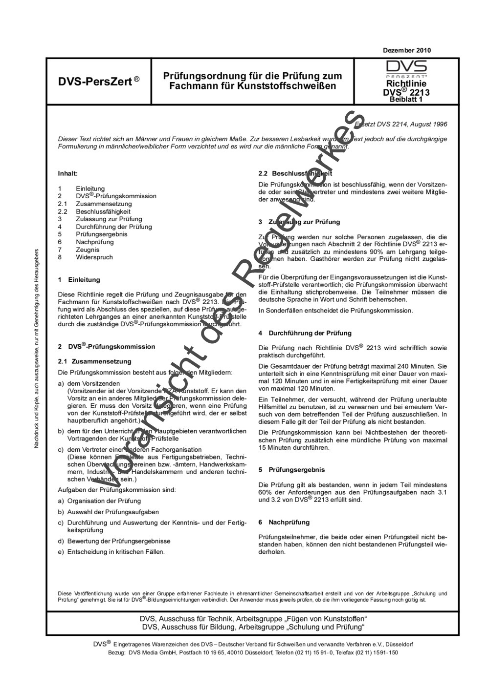 Diese Richtlinie regelt die Prüfung und Zeugnisausgabe für den Fachmann für Kunststoffschweißen nach DVS® 2213. Die Prüfung wird als Abschluss des speziellen, auf diese Prüfung ausgerichteten Lehrganges an einer anerkannten Kunststoff-Prüfstelle durch die zuständige DVS®-Prüfungskommission durchgeführt.