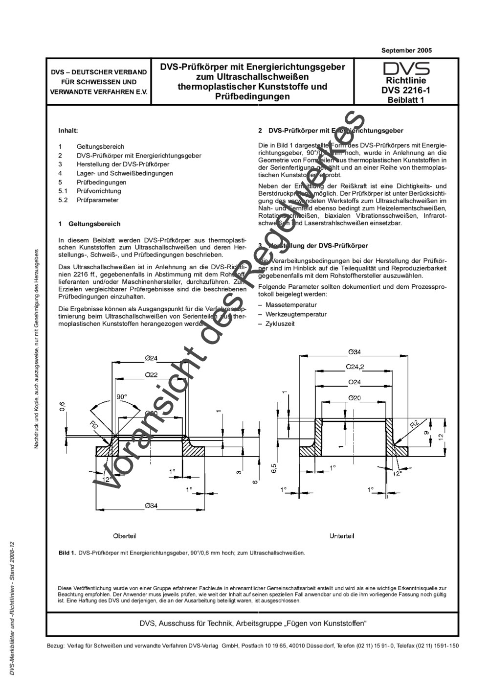 In diesem Beiblatt werden DVS-Prüfkörper aus thermoplastischen Kunststoffen zum Ultraschallschweißen und deren Herstellungs-, Schweiß-, und Prüfbedingungen beschrieben. Das Ultraschallschweißen ist in Anlehnung an die DVS-Richtlinien 2216 ff., gegebenenfalls in Abstimmung mit dem Rohstofflieferanten und/oder Maschinenhersteller, durchzuführen. Zum Erzielen vergleichbarer Prüfergebnisse sind die beschriebenen Prüfbedingungen einzuhalten. Die Ergebnisse können als Ausgangspunkt für die Verfahrensoptimierung beim Ultraschallschweißen von Serienteilen aus thermoplastischen Kunststoffen herangezogen werden.