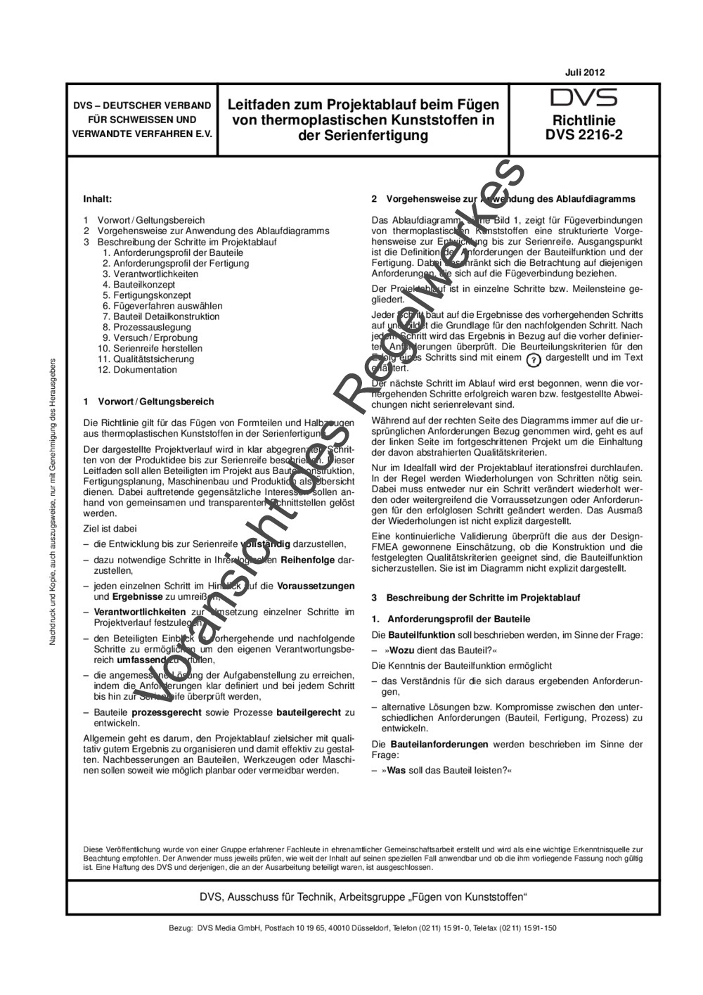 Die Richtlinie gilt für das Fügen von Formteilen und Halbzeugen aus thermoplastischen Kunststoffen in der Serienfertigung. Der dargestellte Projektverlauf wird in klar abgegrenzten Schritten von der Produktidee bis zur Serienreife beschrieben. Dieser Leitfaden soll allen Beteiligten im Projekt aus Bauteilkonstruktion, Fertigungsplanung, Maschinenbau und Produktion als Übersicht dienen. Dabei auftretende gegensätzliche Interessen sollen anhand von gemeinsamen und transparenten Schnittstellen gelöst werden.