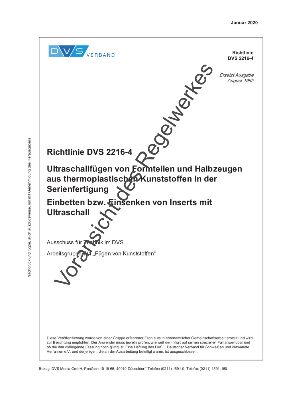 Diese Richtlinie gilt für das Einbetten - auch als Einsenken bezeichnet - von Metall- und Kunststoffinserts (z. B. Gewindeeinsätze, Gewindestifte), die mittels Ultraschall bevorzugt in thermoplastische Kunststoffe eingebettet werden. Für Einbettaufgaben werden die nach Stand der Technik üblichen Ultraschallschweißmaschinen und -geräte eingesetzt, siehe Richtlinie DVS 2216-1.