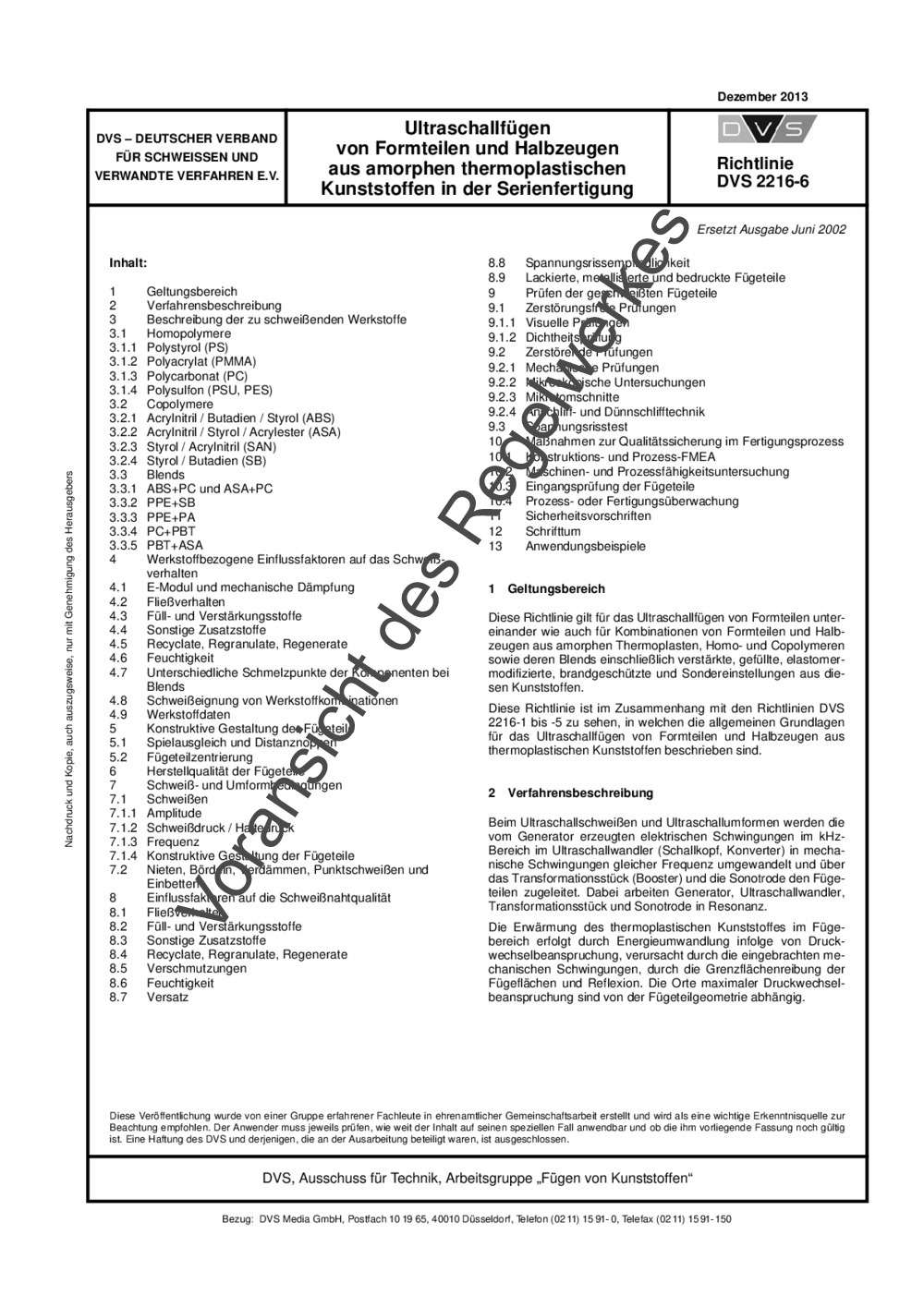 Diese Richtlinie gilt für das Ultraschallfügen von Formteilen untereinander wie auch für Kombinationen von Formteilen und Halbzeugen aus amorphen Thermoplasten, Homo- und Copolymeren sowie deren Blends einschließlich verstärkte, gefüllte, elastomermodifizierte, brandgeschützte und Sondereinstellungen aus diesen Kunststoffen. Diese Richtlinie ist im Zusammenhang mit den Richtlinien DVS 2216-1 bis -5 zu sehen, in welchen die allgemeinen Grundlagen für das Ultraschallfügen von Formteilen und Halbzeugen aus thermoplastischen Kunststoffen beschrieben sind.