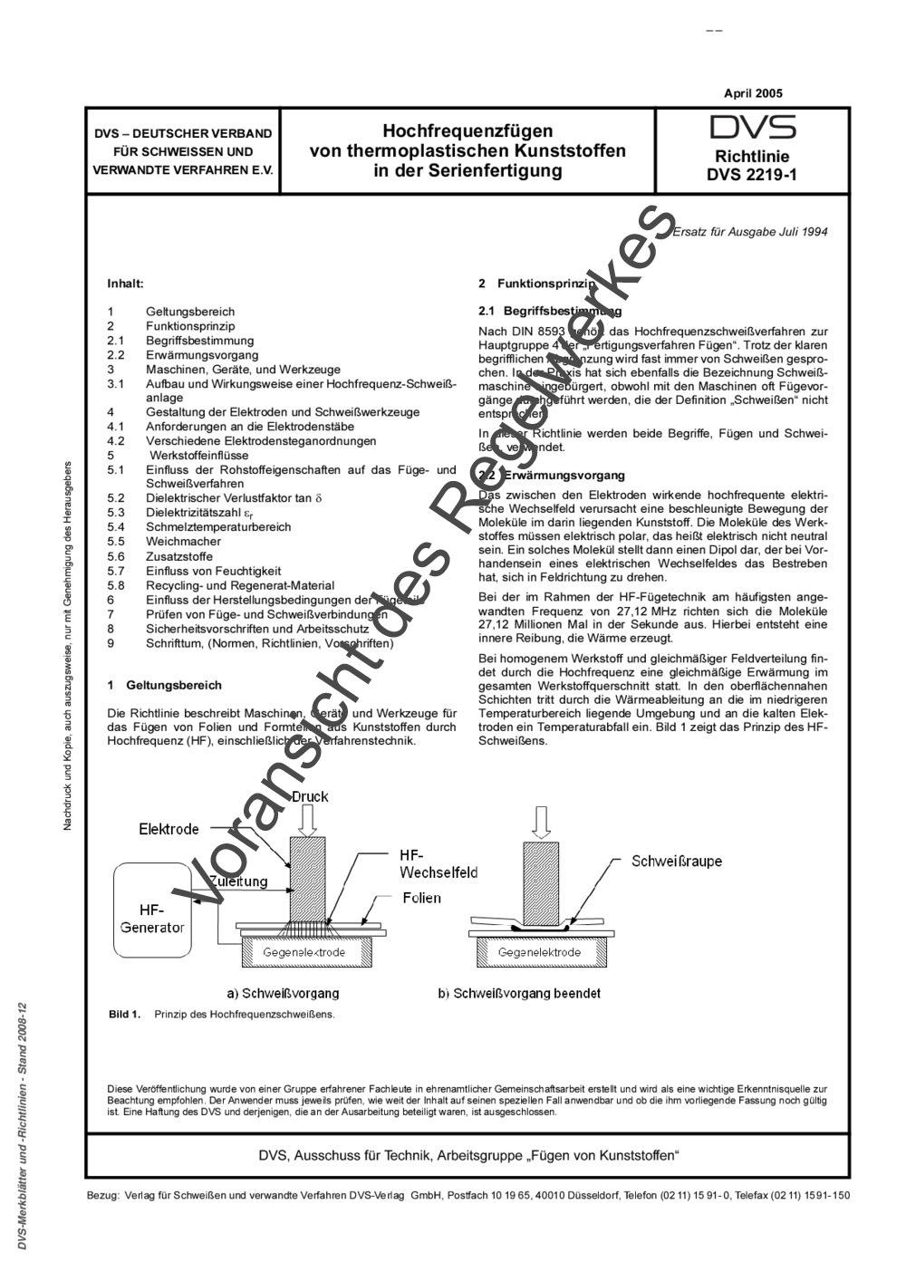 Diese Richtlinie gilt für das Warmgasextrusionsschweißen (WE, im Folgenden Extrusionsschweißen genannt) von Rohren und Tafeln im Behälter-, Apparate- und Rohrleitungsbau, bei der Herstellung von selbsttragenden Auffangwannen und von Abdichtungen an Betonbauwerken mit thermoplastischen Kunststoffen. Sie beschreibt die unterschiedlichen Verfahren, zeigt die Verfahrensgrenzen auf und legt Anforderungen zur Qualitätssicherung fest. Spezielle Hinweise zum Extrusionsschweißen von Dichtungsbahnen im Erd- und Wasserbau sind in den Richtlinien DVS 2225-1 und DVS 2225-4 enthalten. Hinweise zum Extrusionsschweißen von Mantelrohren finden sich in der Richtlinie DVS 2207-5.