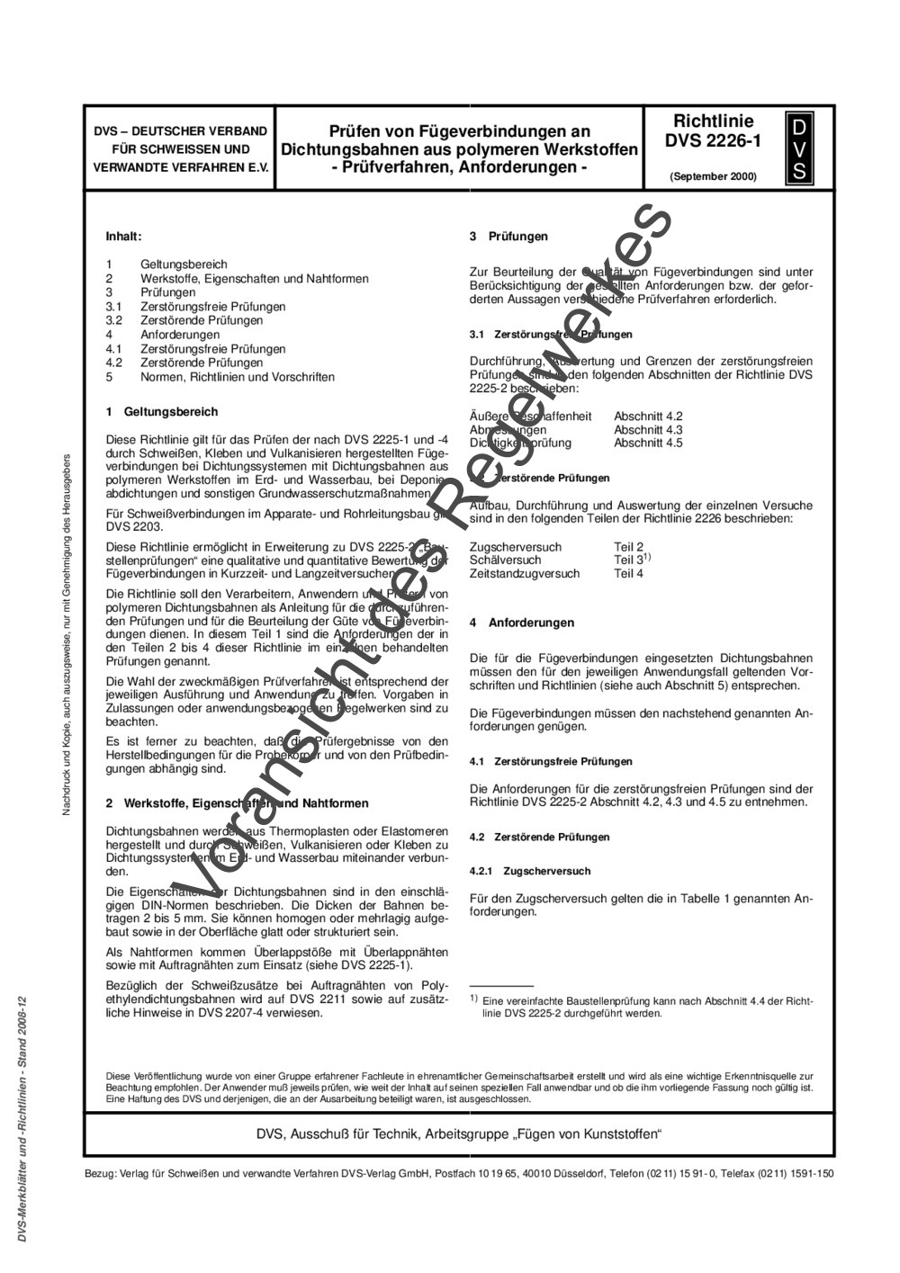 Diese Richtlinie gilt für das Prüfen der nach DVS 2225-1 und -4 durch Schweißen, Kleben und Vulkanisieren hergestellten Fügeverbindungen bei Dichtungssystemen mit Dichtungsbahnen aus polymeren Werkstoffen im Erd- und Wasserbau, bei Deponieabdichtungen und sonstigen Grundwasserschutzmaßnahmen. Für Schweißverbindungen im Apparate- und Rohrleitungsbau gilt DVS 2203. Diese Richtlinie ermöglicht in Erweiterung zu DVS 2225-2 „Baustellenprüfungen“ eine qualitative und quantitative Bewertung der Fügeverbindungen in Kurzzeit- und Langzeitversuchen. Die Richtlinie soll den Verarbeitern, Anwendern und Prüfern von polymeren Dichtungsbahnen als Anleitung für die durchzuführenden Prüfungen und für die Beurteilung der Güte von Fügeverbindungen dienen. In diesem Teil 1 sind die Anforderungen der in den Teilen 2 bis 4 dieser Richtlinie im einzelnen behandelten Prüfungen genannt. Die Wahl der zweckmäßigen Prüfverfahren ist entsprechend der jeweiligen Ausführung und Anwendung zu treffen. Vorgaben in Zulassungen oder anwendungsbezogenen Regelwerken sind zu beachten. Es ist ferner zu beachten, daß die Prüfergebnisse von den Herstellbedingungen für die Probekörper und von den Prüfbedingungen abhängig sind.