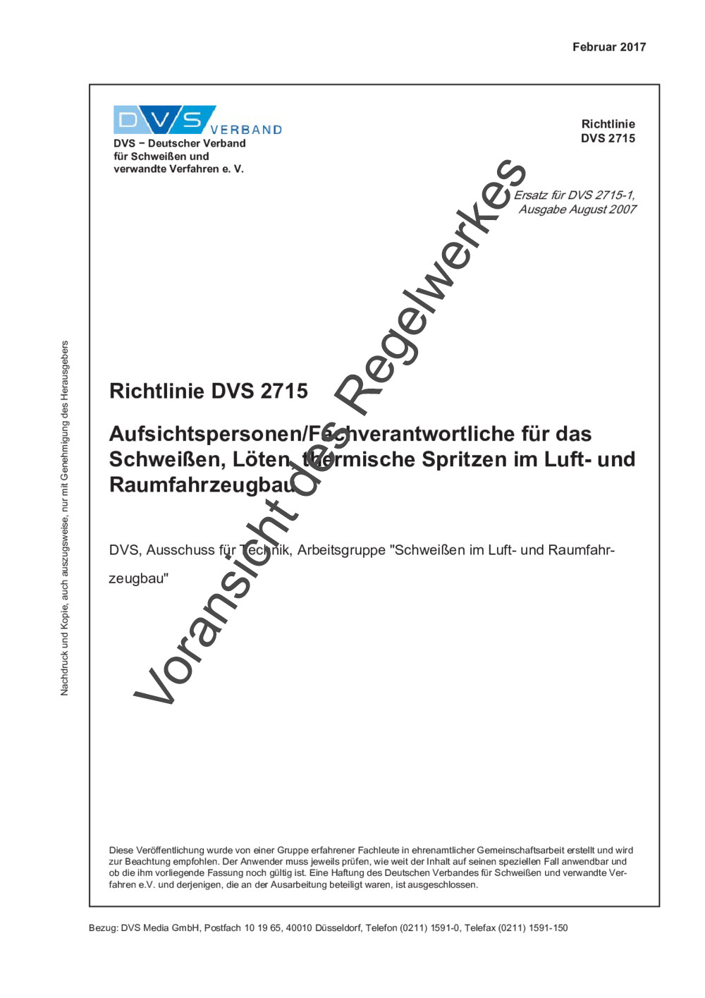 Die mit dem Bundesamt für Ausrüstung, Informationstechnik und Nutzung der Bundeswehr (BAAINBw) - Leiter des Musterprüfwesens für Luftfahrtgerät der Bundeswehr- und mit dem Luftfahrtbundesamt (LBA) abgestimmten Normen DIN 29595 (Schmelzschweißen), DIN ISO 16338 (Widerstandspunkt- und Rollennahtschweißen), DIN 65144 (Thermisches Spritzen) und DIN ISO 11745 (Hartlöten) fordern den Einsatz einer Aufsichtsperson oder eines Fachverantwortlichen. Dies entspricht ebenso den allgemeinen technischen Regelwerken, z. B. DIN EN ISO 3834, NFL II 78/13. ln der vorliegenden Richtlinie DVS 2715 wird die Verfahrensweise zur Anerkennung von Aufsichtspersonen für das Schweißen und/oder Löten bzw. von Fachverantwortlichen für das thermische Spritzen festgelegt. Diese Richtlinie gilt für Betriebe, die Schweiß-, Löt- oder thermische Spritzarbeiten an Luft- und Raumfahrtgerät im zivilen und/oder militärischen Bereich ausführen. Des Weiteren beschreibt die Richtlinie die Aufgaben der Aufsichts-personen/Fachverantwortlichen. Hier gilt gemäß dem Betätigungsfeld des Betriebes die Funktionsfestlegung und Verantwortung nach DIN EN ISO 14731 bzw. nach DIN EN ISO 12690. Ebenso kann entsprechend ihrer Tätigkeit und Qualifikation die Aufsichtsperson betriebsintern als Prüfer im Sinne der Richtlinie DVS 2721 fungieren. Aufgrund zahlreicher Anfragen wird zur Klarstellung in der Richtlinie der Personenkreis genannt, der für die Abnahme der entsprechenden Prüfungen im Luftfahrzeugbau sowie im Raumfahr-zeugbau in Frage kommt. Die bisherige Richtlinie DVS 2715-1 wird durch die Richtlinie DVS 2715 vollständig ersetzt.
