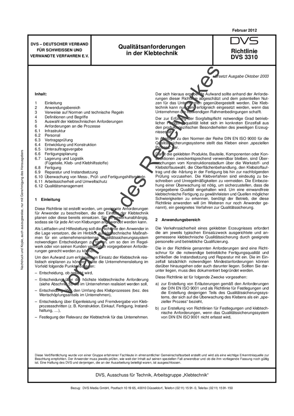 Diese Richtlinie ist erstellt worden, um geeignete Anforderungen für Anwender zu beschreiben, die den Einsatz der Klebtechnik planen oder diese bereits einsetzen. Sie ist gewerkunabhängig, sodass sie für jede Art von Klebungen angewendet werden kann. Als Leitfaden und Hilfestellung soll die Richtlinie den Anwender in die Lage versetzen, die im Hinblick auf klebtechnische Maßnahmen für ein unternehmensinternes Qualitätssicherungssystem notwendigen Entscheidungen zu treffen, um so den im Regelwerk oder von seinen Kunden vertraglich vorgegebenen Anforderungen gerecht werden zu können.